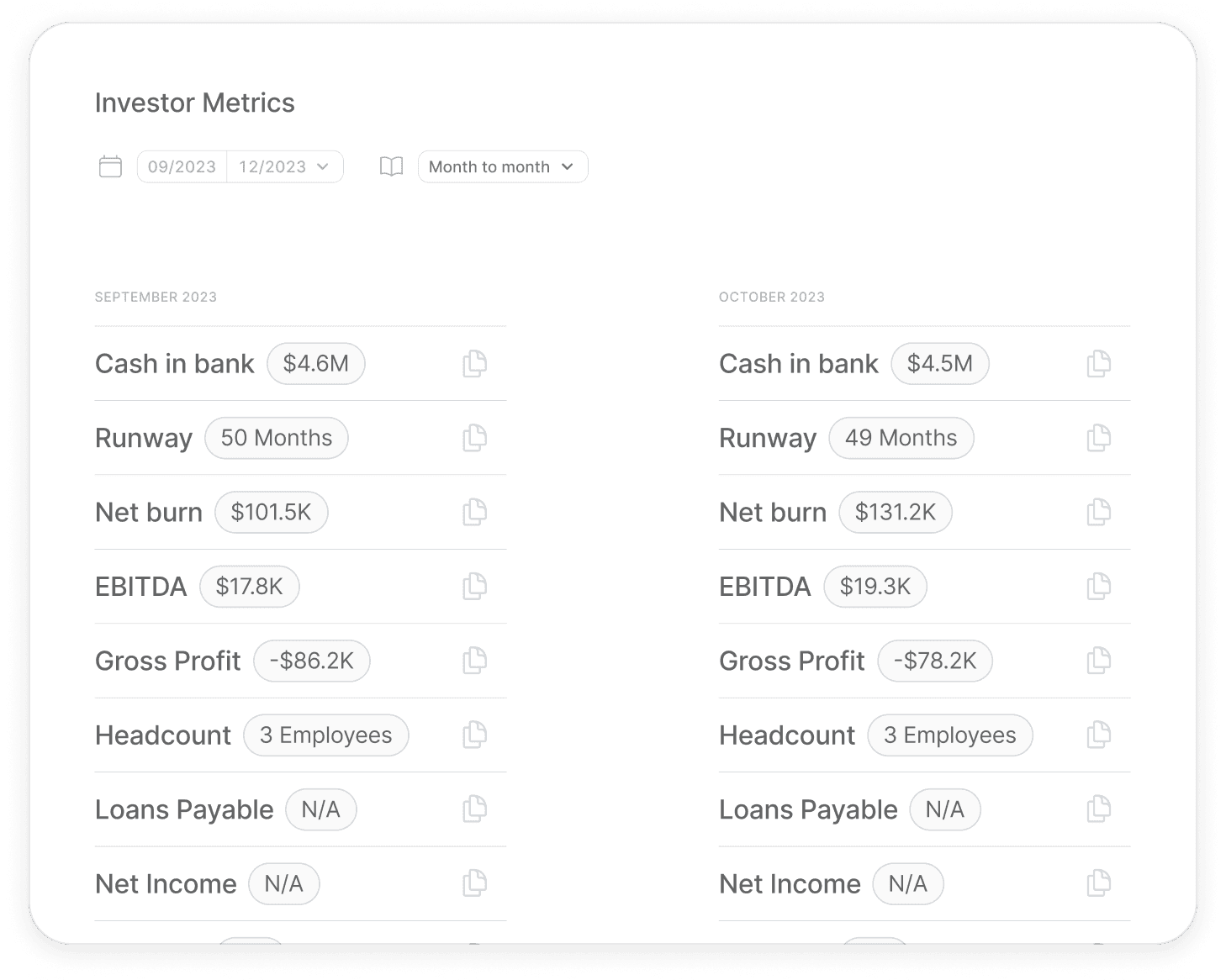 See everything from cash flow and revenue to projected runway and investor metrics.