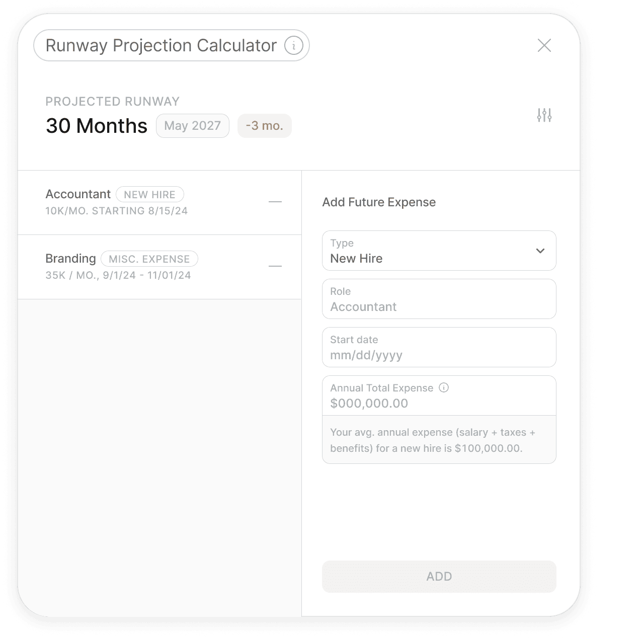 Our runway calculator lets you easily estimate the runway impact of new hires, new expenses, or new revenue.