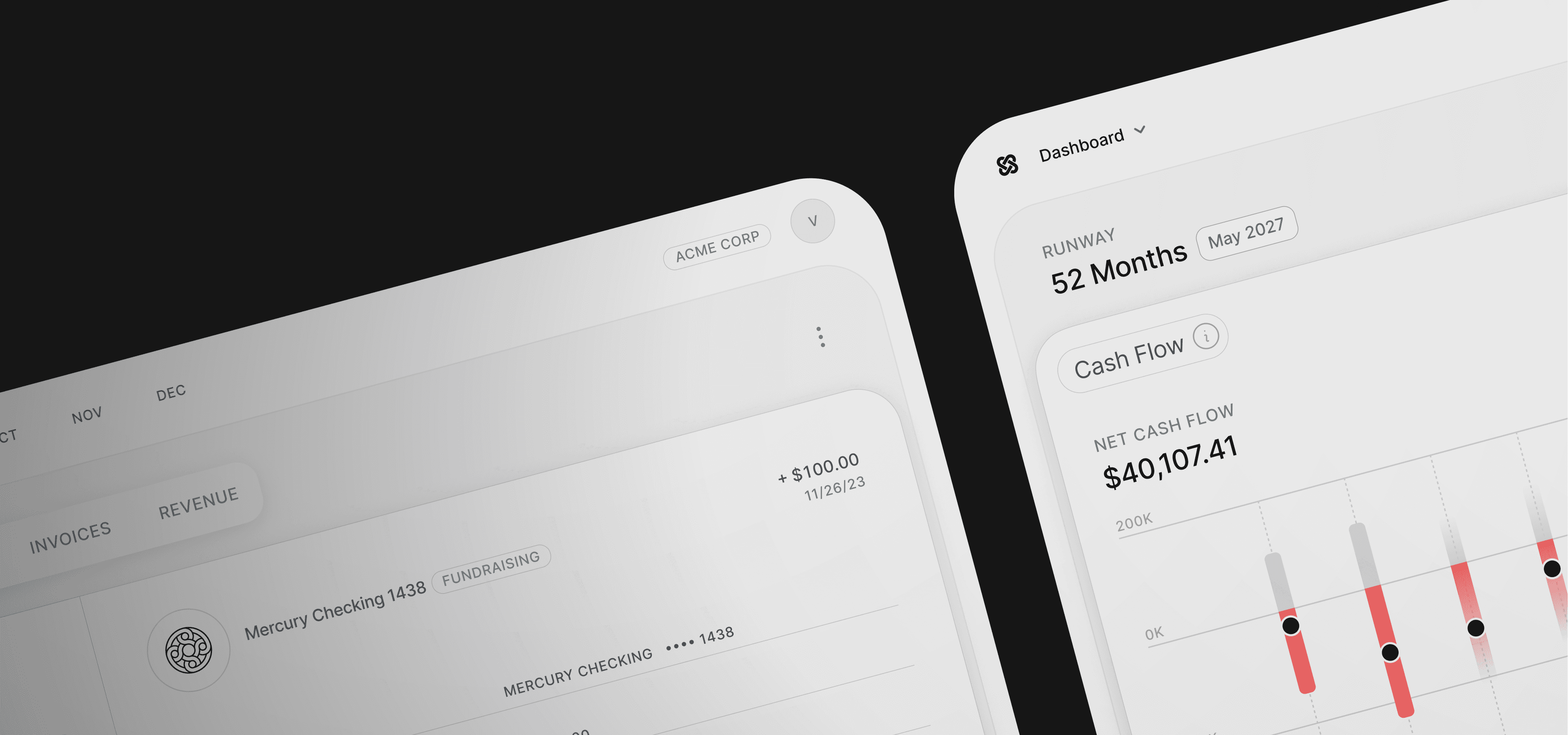 Visualize your financial activity in real time. See everything relevant to your business finances: costs, revenue, the state of your customers and invoices, burn, runway, metrics for investors, and more.